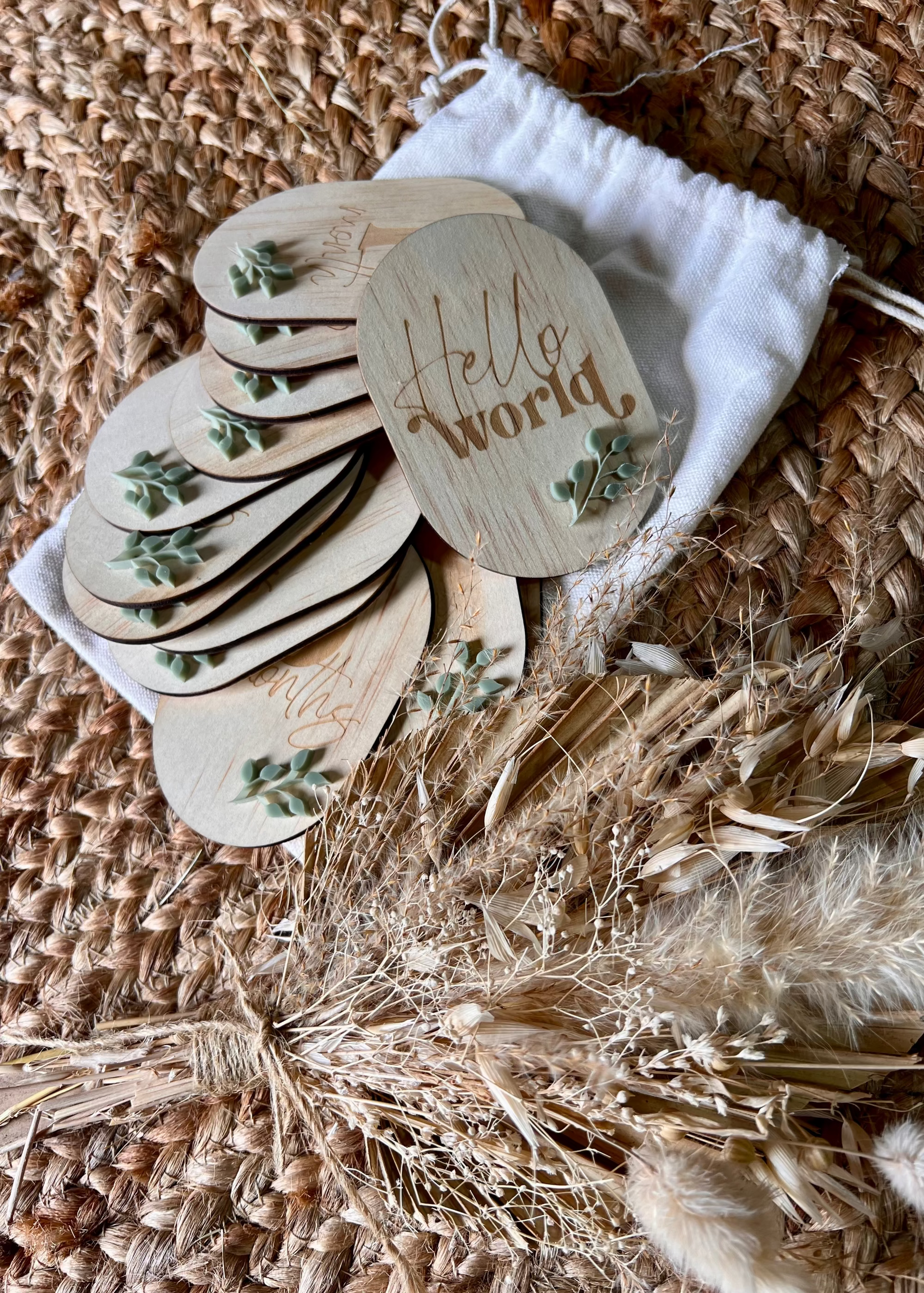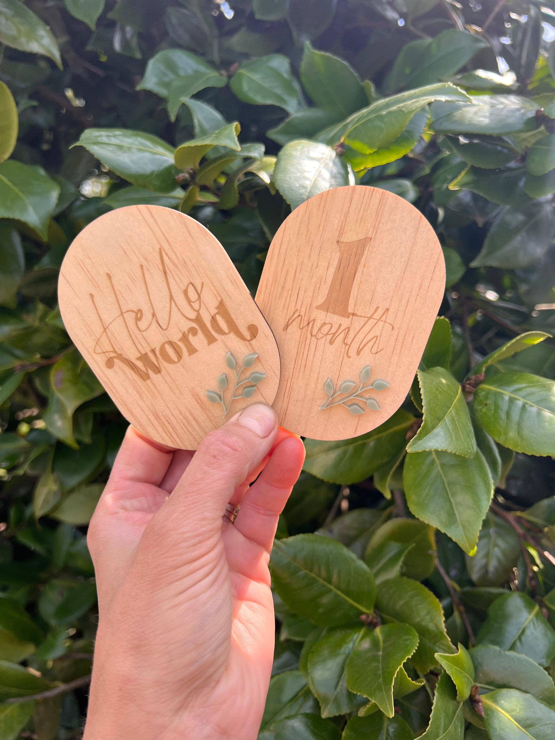 The arch milestones are 10cm in height and engraved into a beautiful hoop ply with a olive green leaf acrylic design.